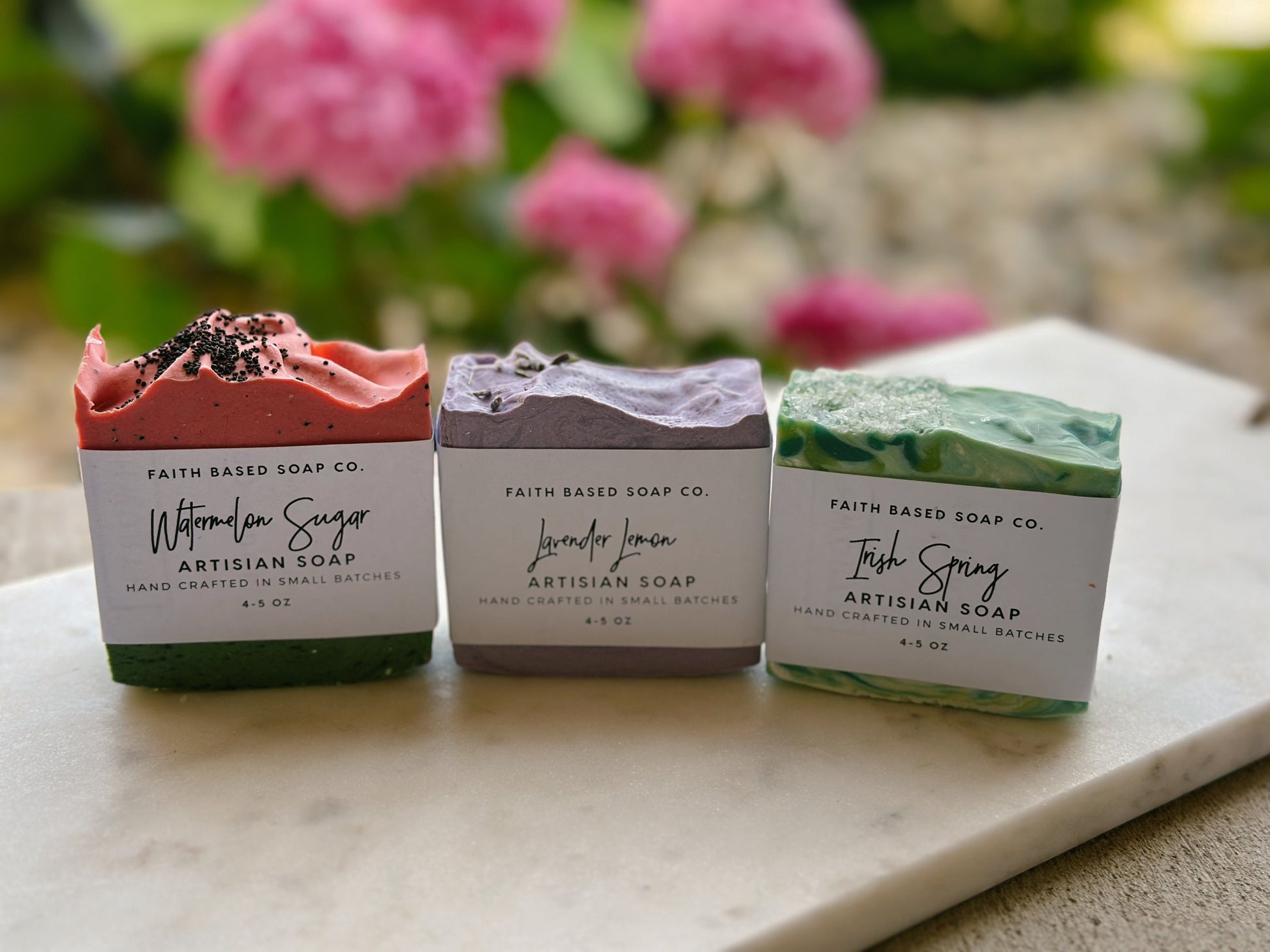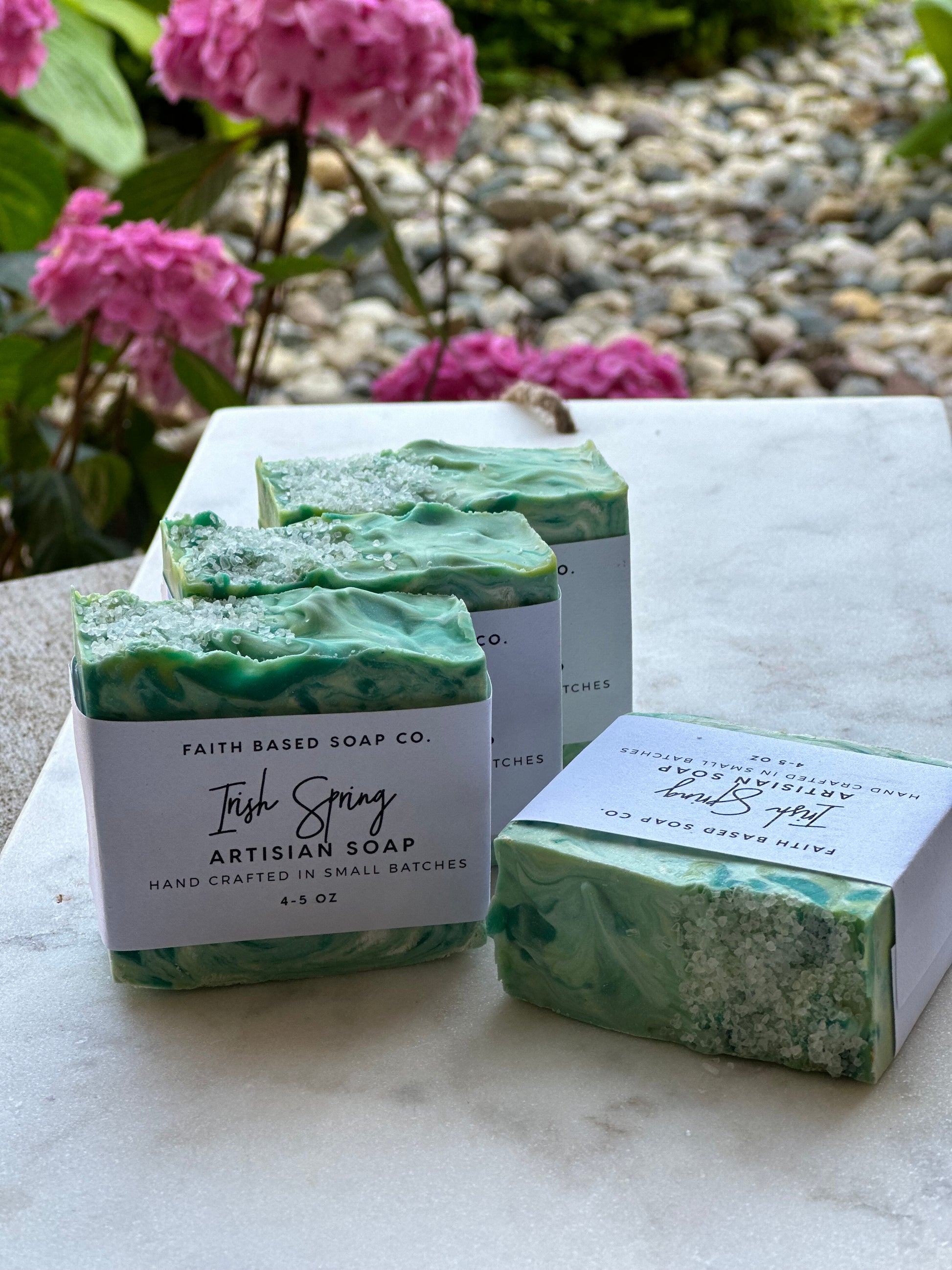 Ingredients: castor oil, rice bran oil, coconut oil, olive oil, lard, shea butter, sodium hydroxide, goat milk, mica, & fragrance oil. Topped with sea salt