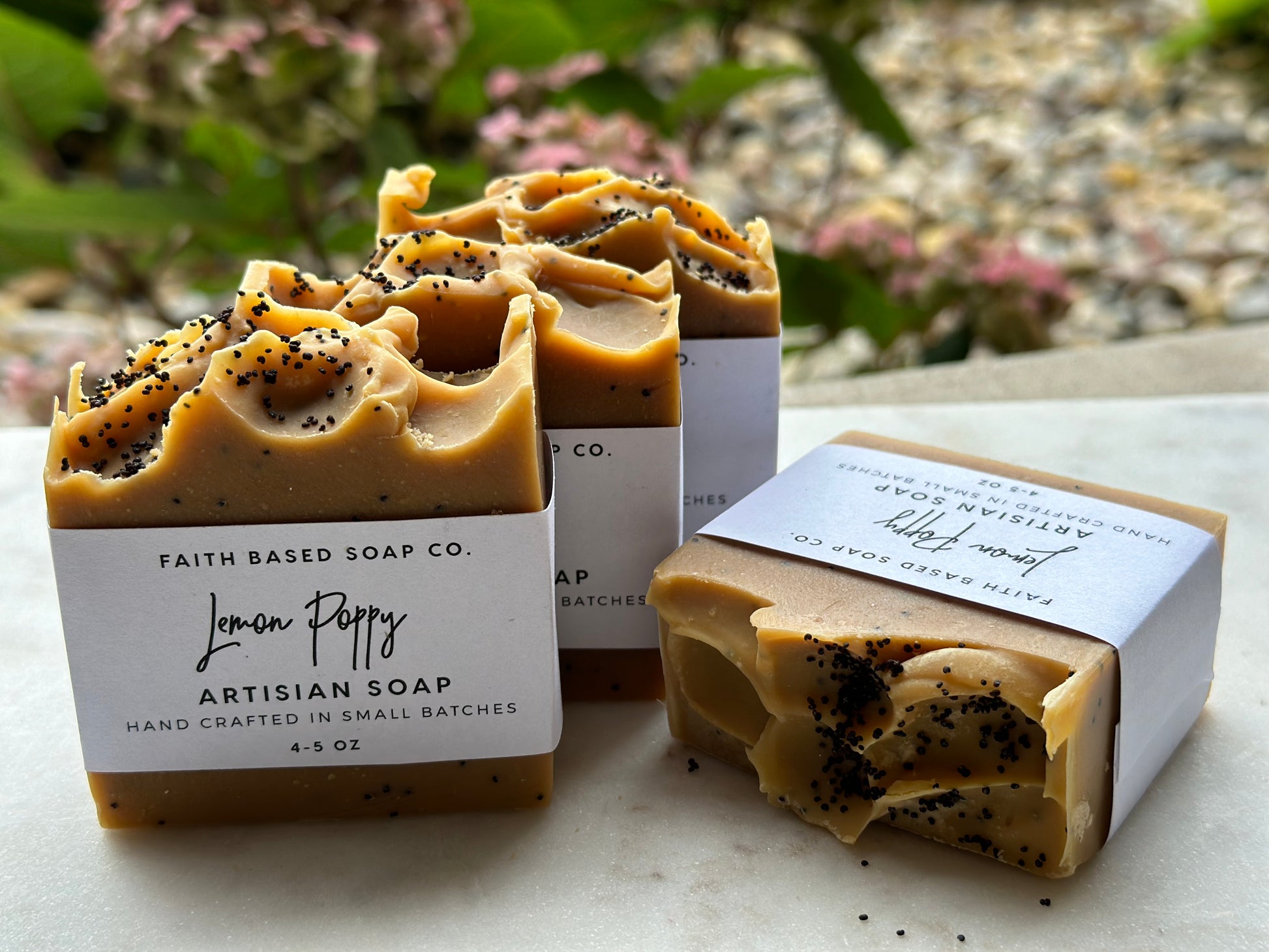 Ingredients: castor oil, olive oil, coconut oil, rice bran oil, lard, shea butter, goat milk, sodium hydroxide, distilled water, mica, fragrance oil, & poppy seeds
