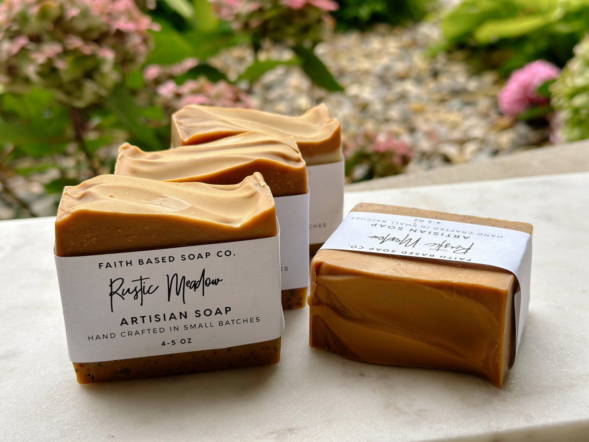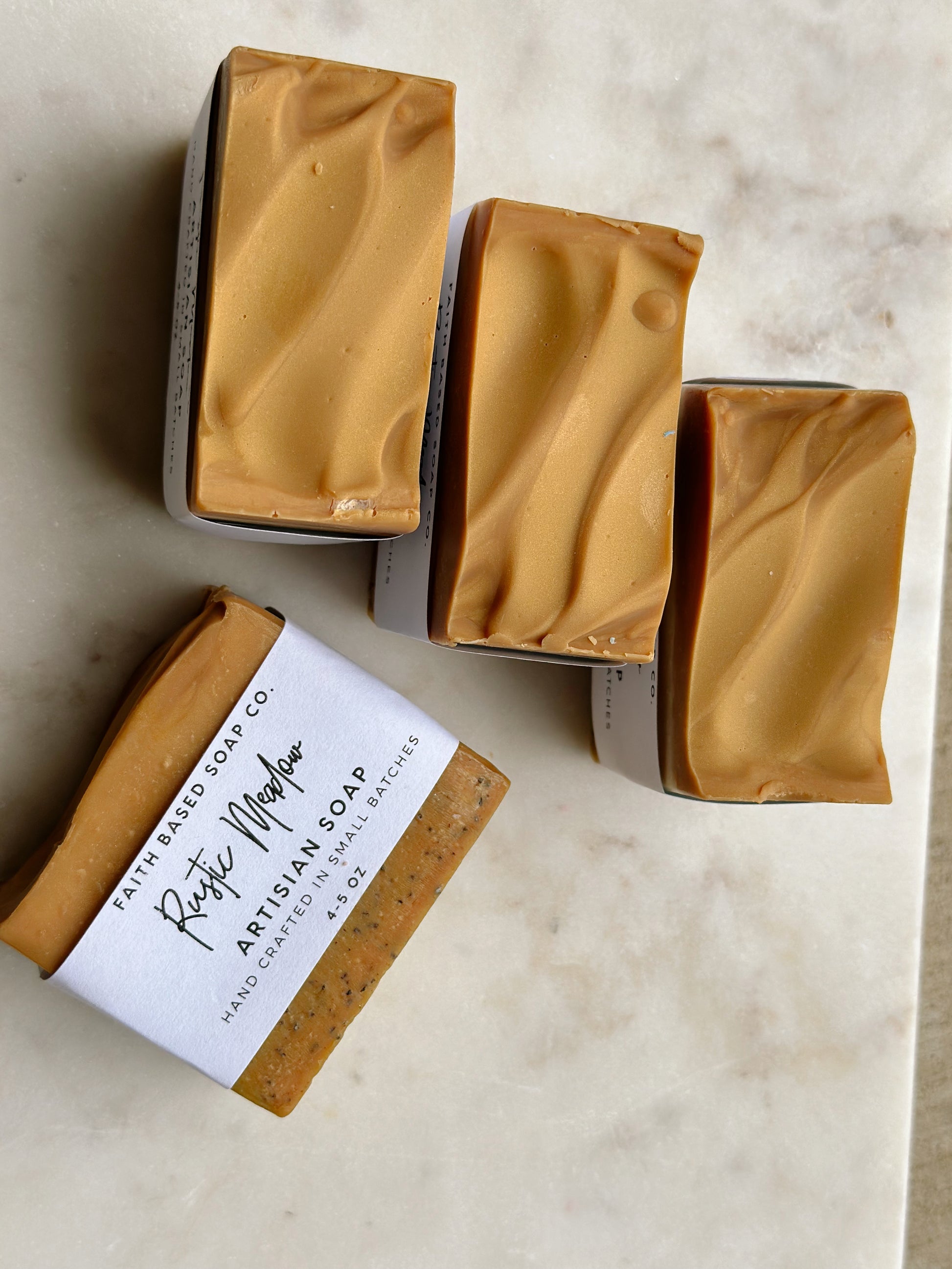 Ingredients: Olive oil, tallow, coconut oil, distilled water, sodium hydroxide, essential oils (patchouli, lemongrass, sandalwood, bergamot), turmeric, mica, & coffee grounds