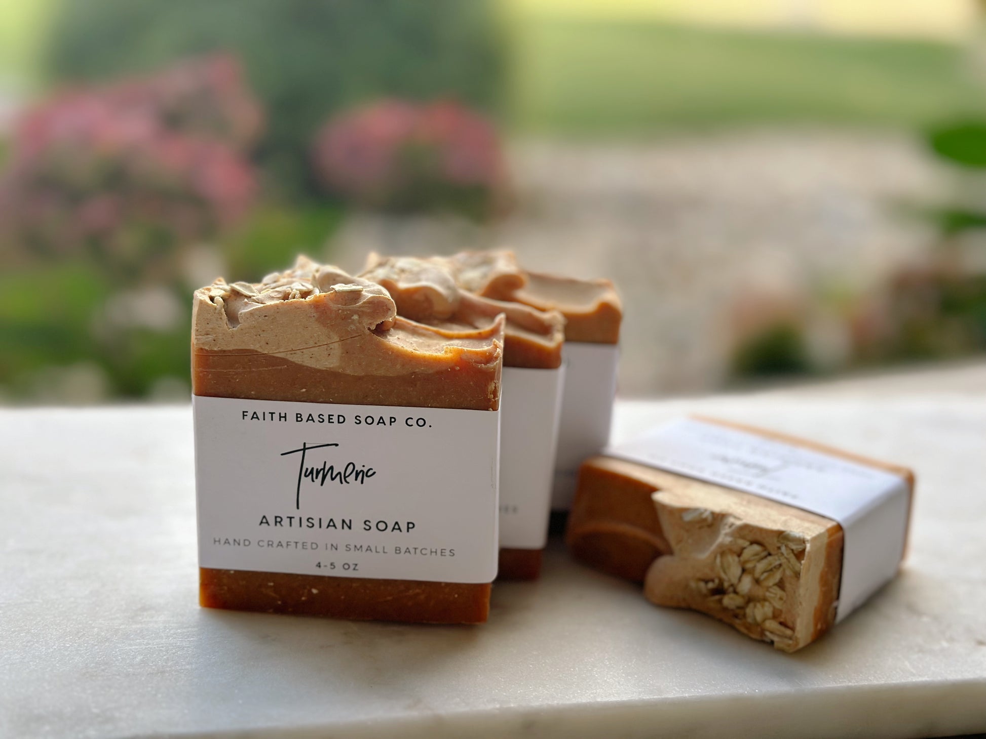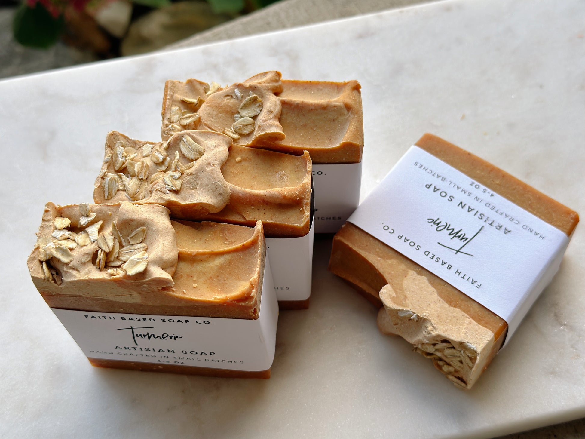 Ingredients: Castor oil, rice brain oil, coconut oil, olive oil, lard, shea butter, goat milk, sodium hydroxide, distilled water, turmeric, colloidal oats, & honey.